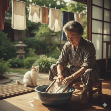 「昔は洗濯板でゴシゴシしてたのよ。今はボタン押すだけでホント楽だわ〜」